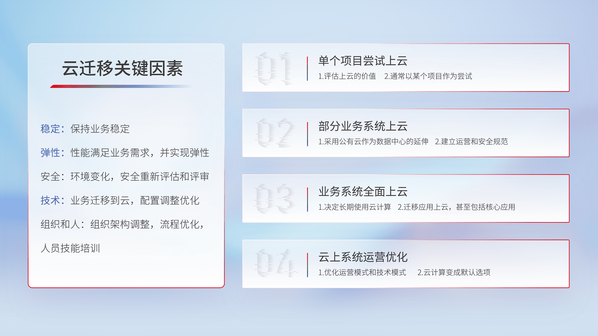 结合实际业务,,,,从规划设计、、、、云平台选型、、、云原生改造、、、、数据迁移、、集成交付,,,迁移全过程为客户识别最佳上云路径,,做好风险识别管理,,,,设计网络架构、、身份权限、、安全审计合规、、、、操作审计、、、、日志审计、、、监控告警策略、、多站点容灾设计等,,,对云上基础设施进行整体规划,,,提升IT治理水平,,,,以满足弹性、、、高可用、、、高性能的需求。。。