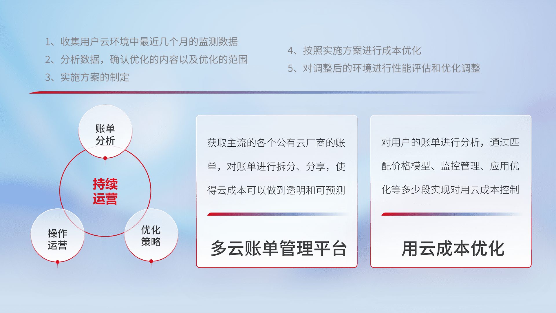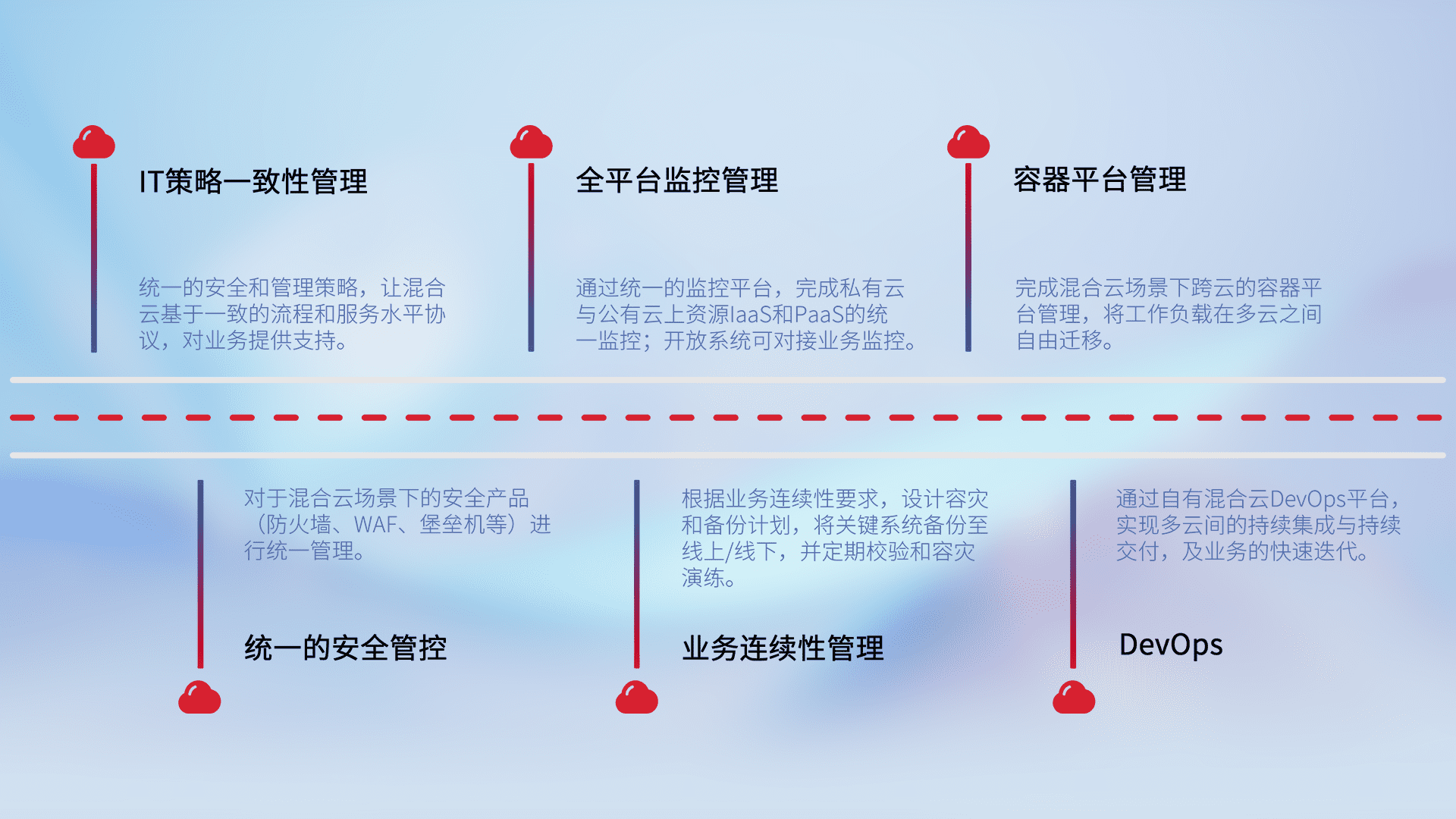 通过多云纳管,,以统一的资源数据模型把客户的云资源进行抽象和封装,,,进而实现对多云资源的统一操作,,,,保障云资源管理的可靠性、、稳定性与可用性。。。量身定制化运维内容,,,,配置、、、、开发运维、、补丁管理、、备份、、、监控、、、认证和访问管理、、、审计和日常巡检等,,,保障在用云过程中的可靠度,,,稳定度以及高可用率。。。。